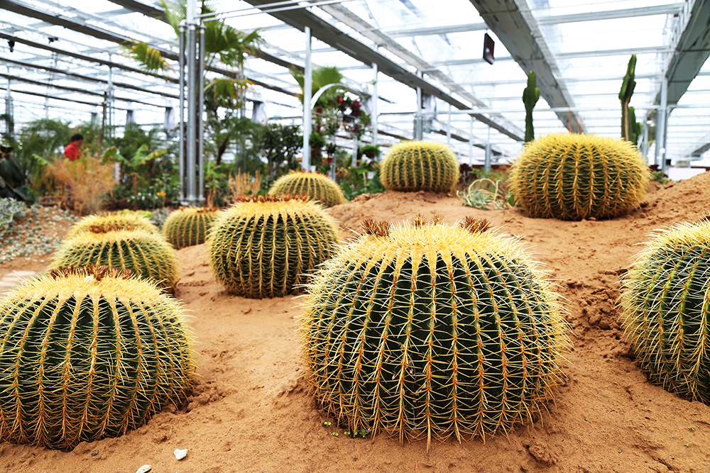 該智能溫室大棚占地約6000平方米,分為一號廳和二號廳。其中一號廳是新建的有錯層的玻璃溫室,分為盆栽花卉、盆栽果樹區、沙生植物區、熱帶風情區、家庭園藝區等功能區。二號廳由舊溫室改造而成,頂部為陽光板,四周立面為玻璃,配置了智能控制系統,有無土栽培區、育苗區、采栽體驗區等功能區。智能溫室全部配備了內、外保溫系統,冬季保溫,比普通溫室更節能。溫棚內移動苗床一次育苗30萬株,可供給巴彥霍德406座溫棚,一定程度上帶動了農民增收。不論是熱帶植物、水果還是沙漠植物,在這里你可以一覽無余,一年四季感受綠色勃勃生機。