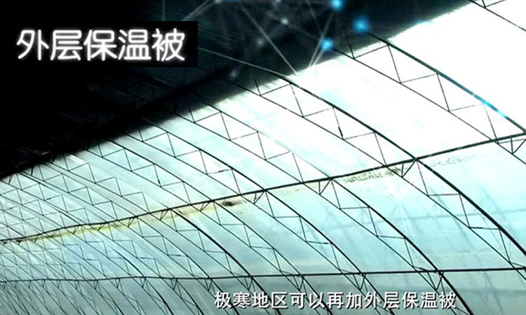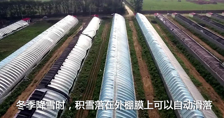 內(nèi)保溫日光溫室采用新型防水保溫覆蓋材料,導(dǎo)熱系數(shù)僅為0.038W/(㎡·K),內(nèi)置的保溫被不受雨雪風(fēng)和太陽直射的影響,使用壽命延長。冬季降雪時,積雪落在外棚膜上可以自動滑落。避免雪災(zāi)危害,極寒地區(qū)可以再加外層保溫被,形成雙層保溫被,作物可以安全越冬。