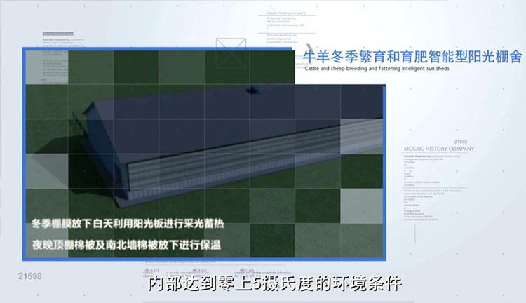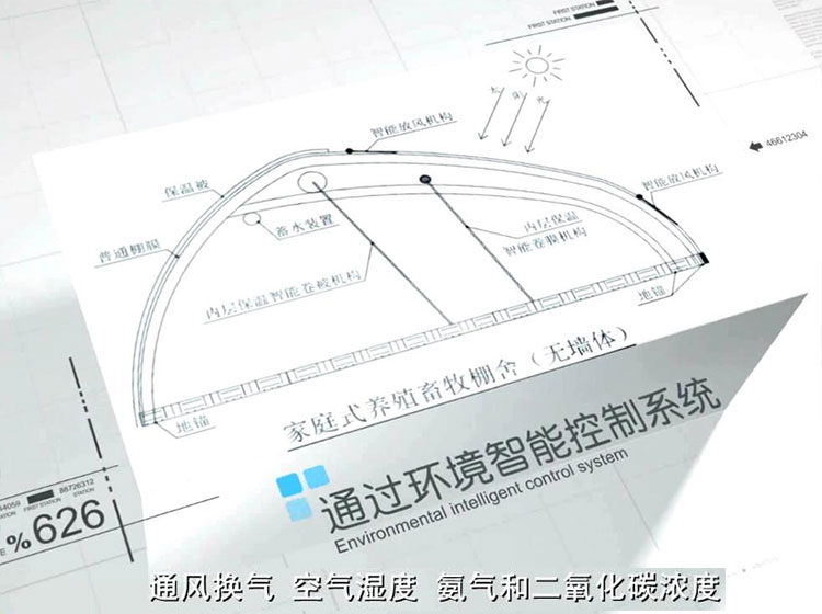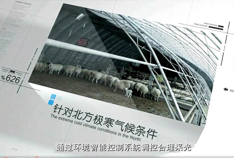 棚舍從設計、施工均為標準化模塊進行,冬季不需任何供暖,白天利用陽光板進行采光蓄熱,夜晚頂棚棉被及南北墻棉被放下進行保溫,可實現畜牧棚舍外界零下30攝氏度,內部達到零上5攝氏度的環境條件。夏季南北墻棚膜卷起實現良好通風。冬季屋頂配置動力風機,根據舍內有害氣體濃度進行自動換氣。