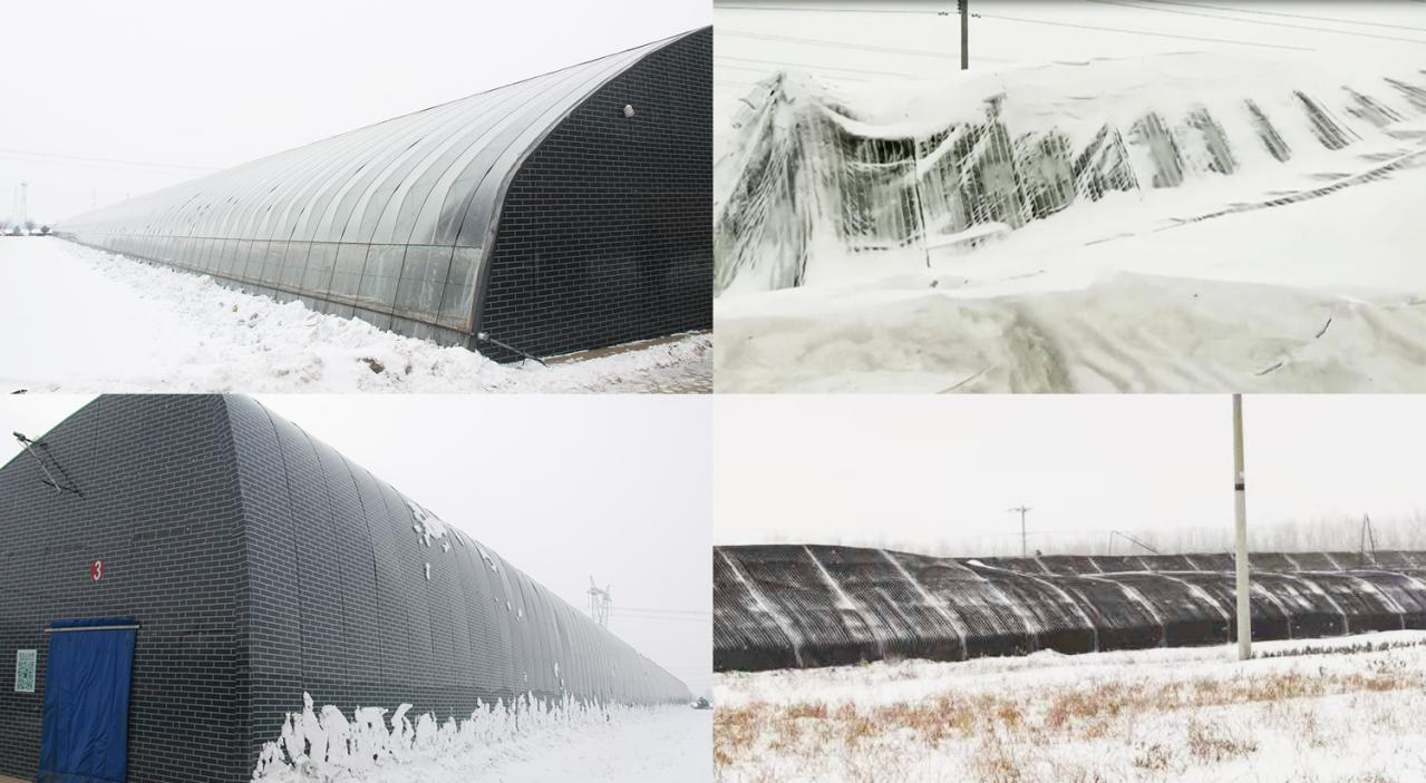 在寒冷的冬季里,若遇到突如襲來的降雪或狂風,北方高寒地區(qū)設施農業(yè)生產將會受到嚴重影響,北方多數(shù)溫室因為積雪和狂風導致坍塌,而這時水蓄熱內保溫裝配式日光溫室表現(xiàn)出強勁的使用性能。圖一為水蓄熱內保溫裝配式日光溫室,內保溫被正常卷起,落在溫室棚膜上的積雪自動滑落,不影響設施使用及作物生長。圖二為普通外保溫溫室,外保溫被積雪,不能卷起,設施承重增加,多半溫室被積雪壓塌,嚴重壓傷農作物,同時溫室內無光照,無法積溫及進行作物生長。